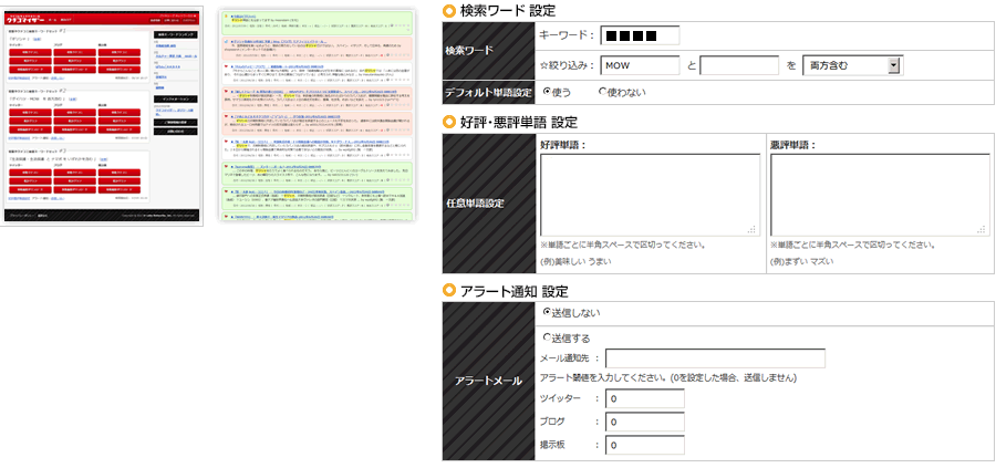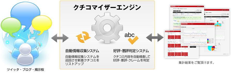 御指定キーワードを基に、弊社指定のクチコミサイトへ自動情報収集システムを巡回させ新着クチコミ・レビュー・クレーム・etcをリストアップします。