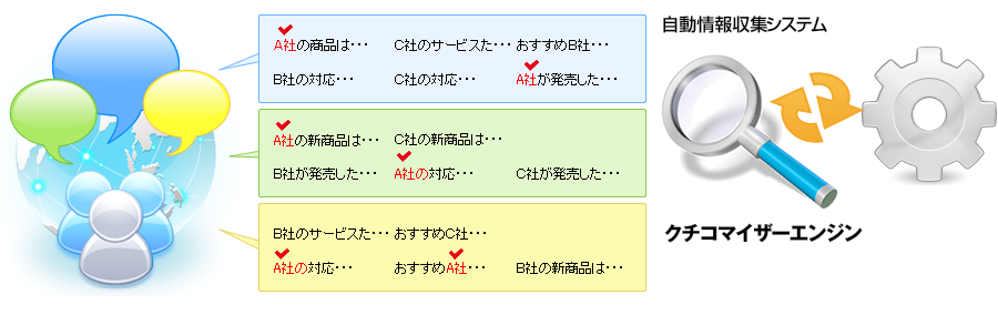 24時間365日、主要ブログ、ツイッター、主要掲示板から指定キーワードの含まれる新着情報を収集し続けます。 下図は指定キーワードを「A社」とした場合のイメージです。