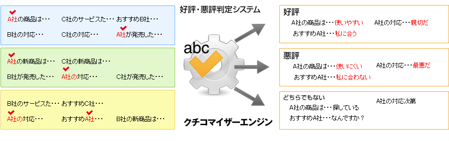 クチコミ情報収集システムが収集した情報を好評・悪評判定システムが分別し、次工程の内容精査時間を大幅に削減します。